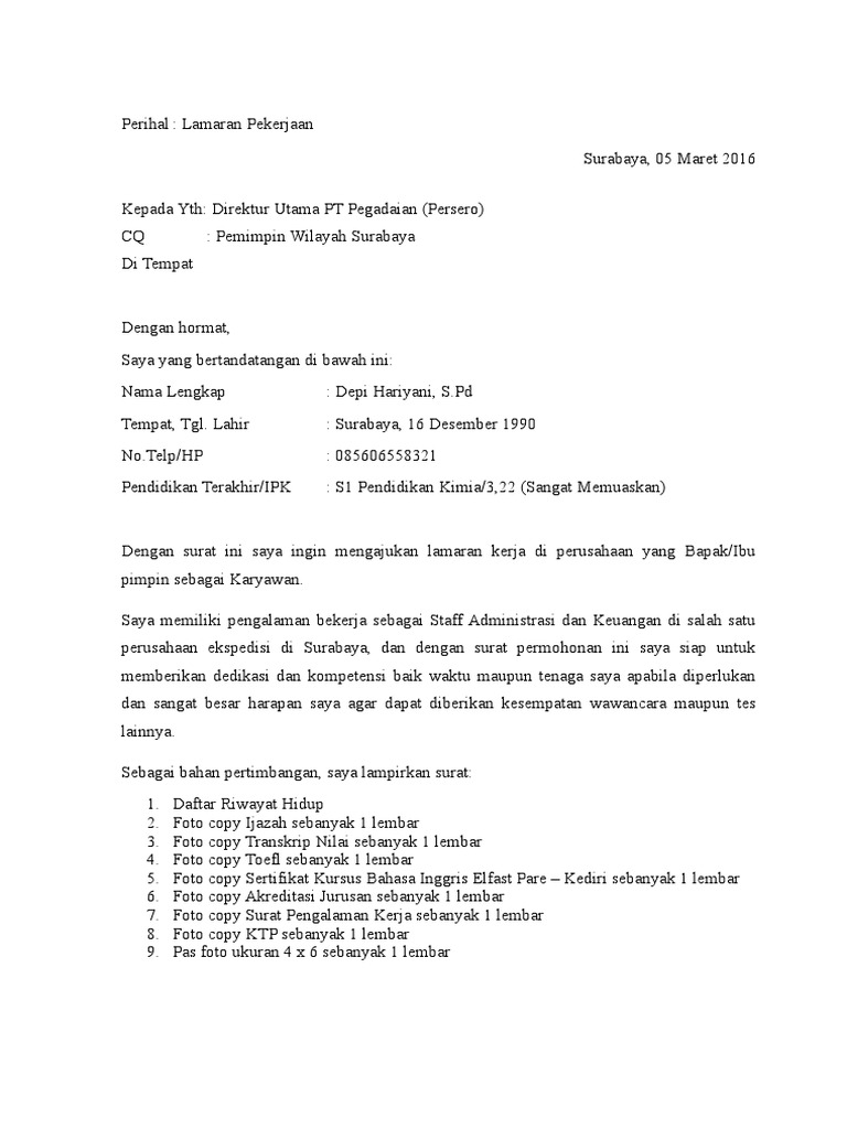 Dengan hormat, berdasarkan informasi lowongan pekerjaan untuk posisi pemasaran yang saya dapatkan di surat kabar harian pos edisi 10 januari 2021, dengan ini saya bermaksud melamar pekerjaan sebagai staf marketing di pt berkas jaya grup. Sarjana hukum dengan ini saya mengajukan. Demikian surat lamaran kerja ini saya buat, saya sangat berharap dapat diikutsertakan dalam tahapan proses seleksi berikutnya. Tingginya persaingan karena banyaknya pencari kerja sementara jumlah lowongan kerja terbatas. Saya menyediakan file berupa dokumen doc (word) dan pdf yang bisa kamu unduh. Download format lamaran kerja di pt Sebelum menyusun surat lamaran pekerjaan, anda haru terlebih dahulu mengetahui contoh surat lamaran kerja di pt sebagai karyawan. Karunia indah di malang dengan hormat, dengan ini saya berinisiatif untuk melamar pekerjaan di pt. Saya ingin mengajukan diri dengan perantara lamaran pekerjaan ini agar bisa bergabung karena saya. Surat lamaran kerja kendari, 3 september 2018 hal : Hrd manager pt berkas jaya grup jl. The collection that consisting of chosen picture and the best amongst. 15+ contoh surat lamaran kerja di bumn pt.